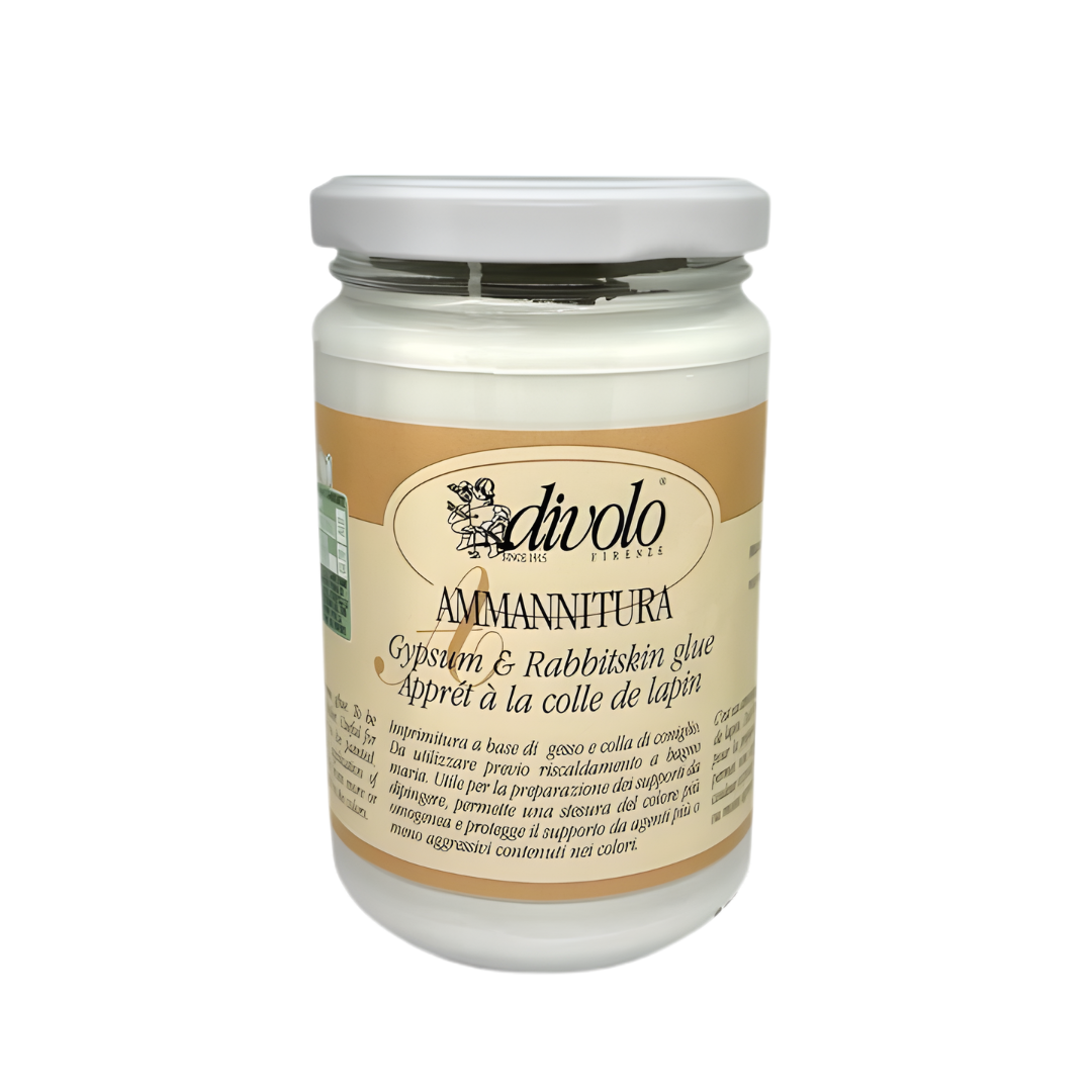 La Ammannitura Divolo Firenze es una preparación tradicional compuesta por yeso de Bolonia y cola de conejo, fundamental en la técnica del dorado para obtener una base adecuada para la aplicación de la hoja metálica. También se utiliza en pintura para la preparación de soportes de madera o lienzo, creando una superficie homogénea, compacta y resistente que mejora la adherencia del color y protege el soporte frente a agentes agresivos presentes en los pigmentos o aglutinantes.