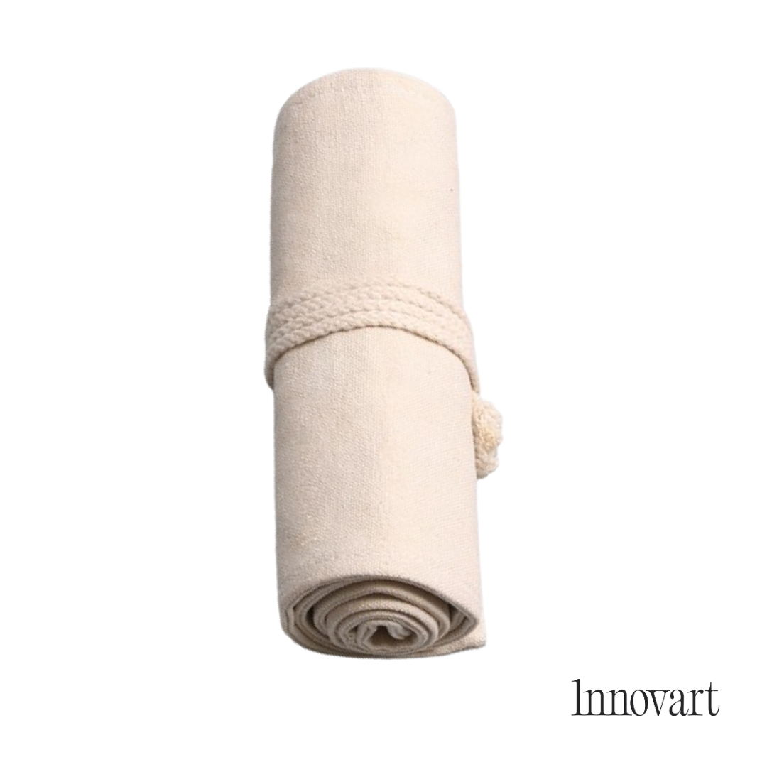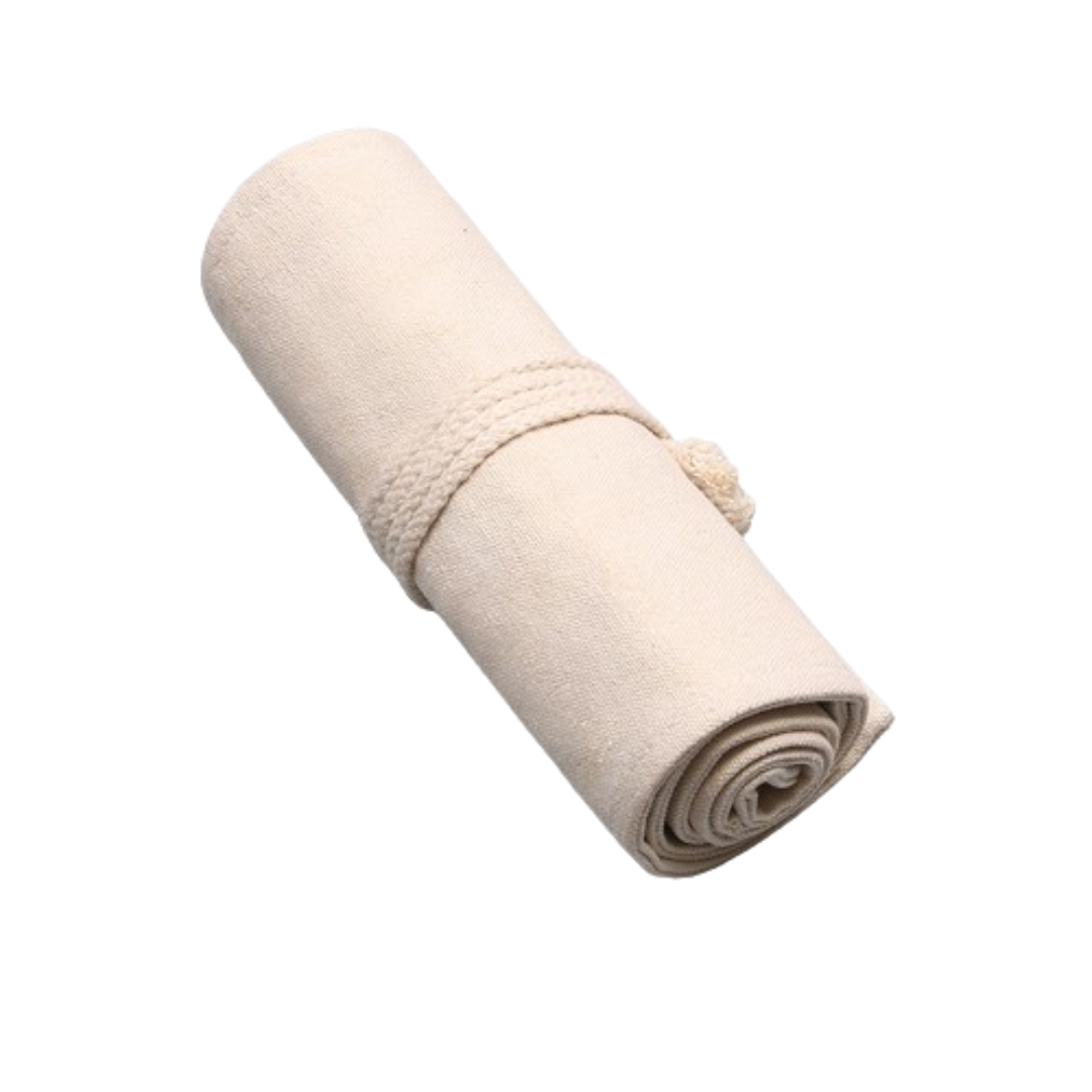 Estuche enrrollable de tela tipo Japón en algodón natural. Ideal para set de espátulas, pequeños pinceles, bisturís, lápices o herramientas. Ligero, resistente y fácil de transportar.